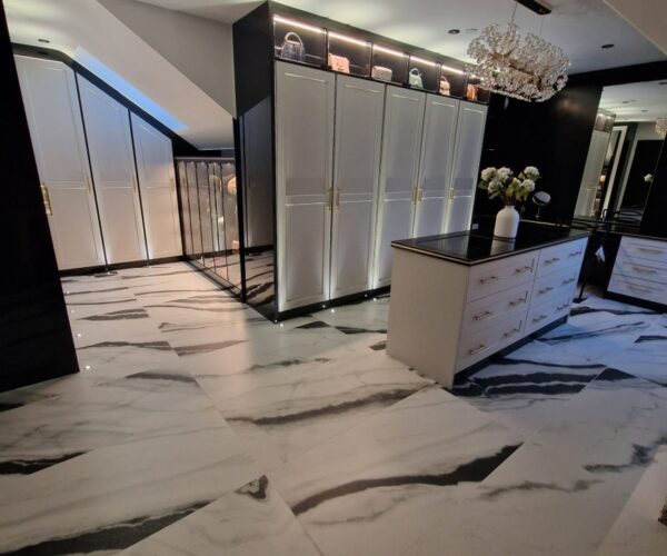 This project showcases the transformation of a mundane space into an exquisite walk-in wardrobe and dressing room, demonstrating the versatility of our stunning tile collections beyond traditional kitchen and bathroom applications.