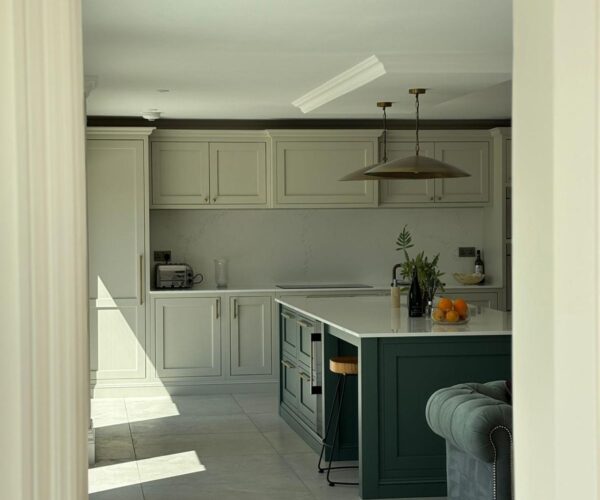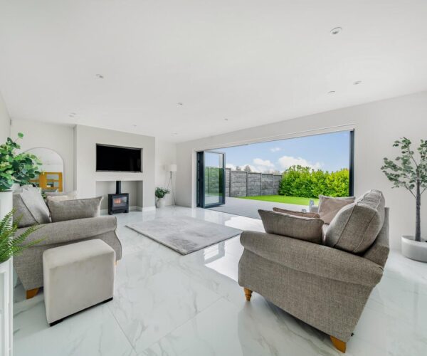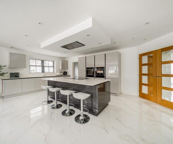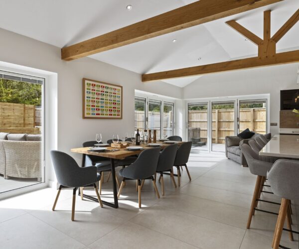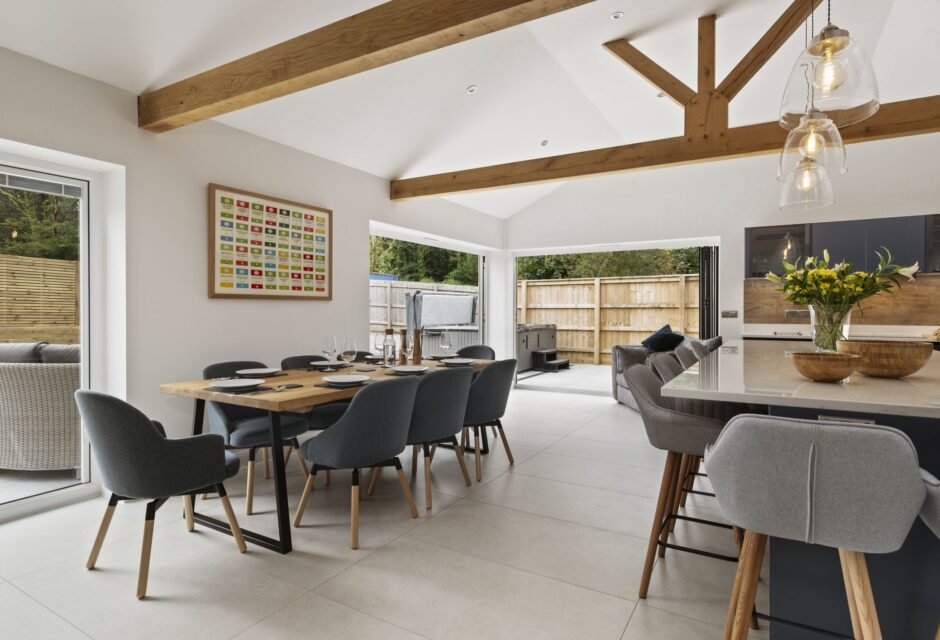 In the pursuit of an understated yet beautiful design, the homeowners of a gorgeous residence opted for light grey 800×800 stone-effect porcelain tiles throughout the kitchen, diner, hall, and orangery.