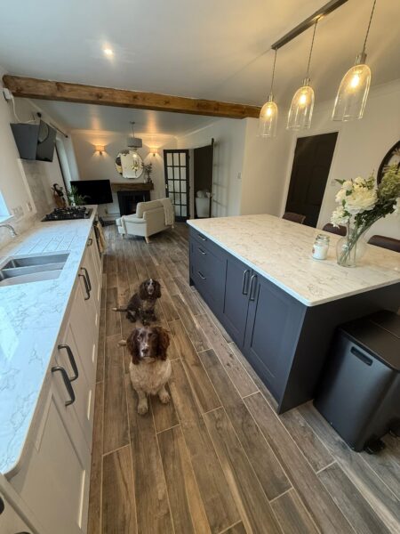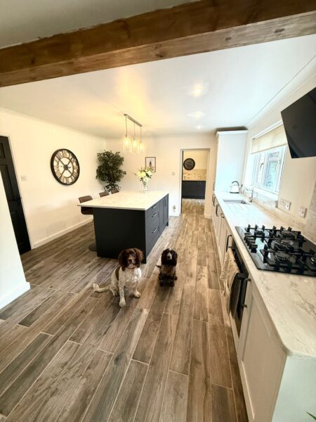 In the kitchen-dining area, durable porcelain tiles were used—offering a stylish look that’s also pet-friendly and easy to maintain. The perfect blend of comfort and practicality… even the dogs approve!