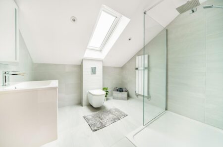 In the bathroom, a light ivory matt tile paired with a coordinating mosaic in the wet room creates a calm, spa-like atmosphere.