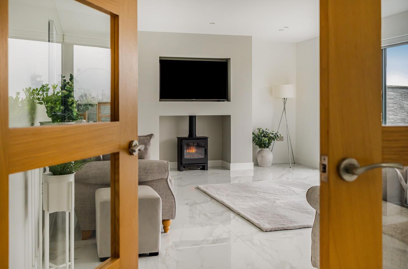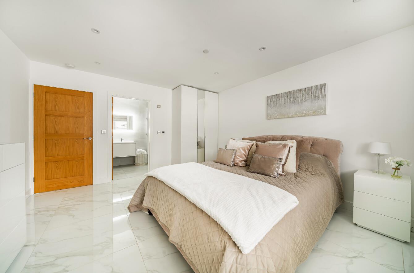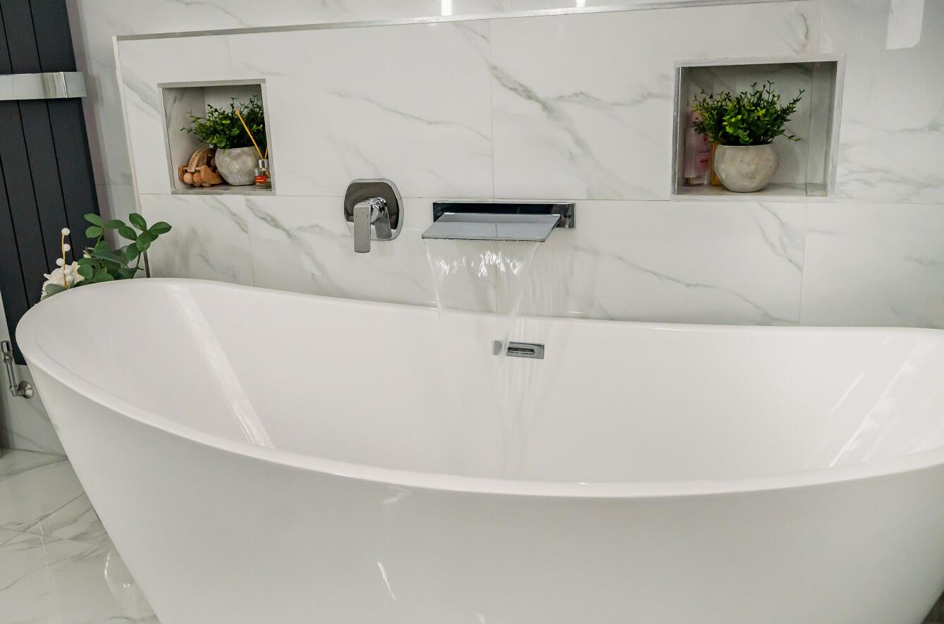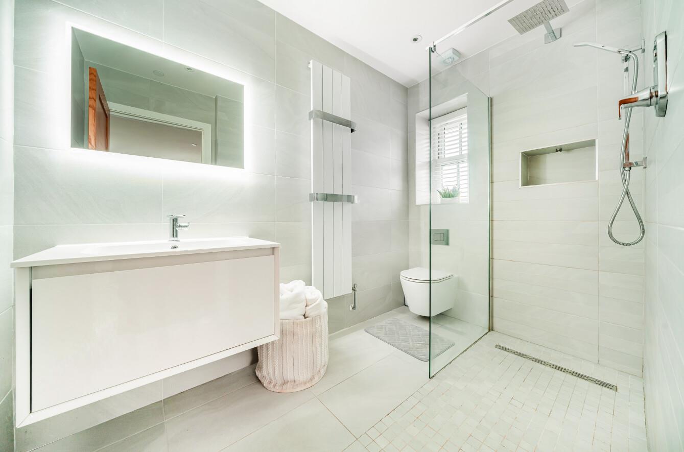 In the bathroom, a light ivory matt tile paired with a coordinating mosaic in the wet room creates a calm, spa-like atmosphere.