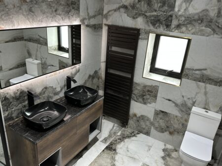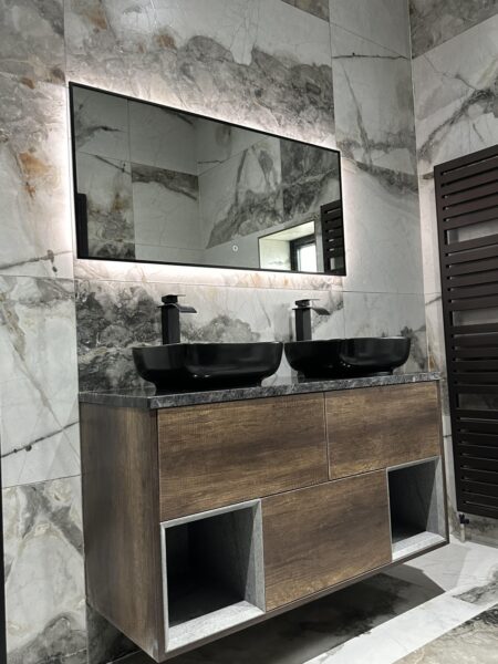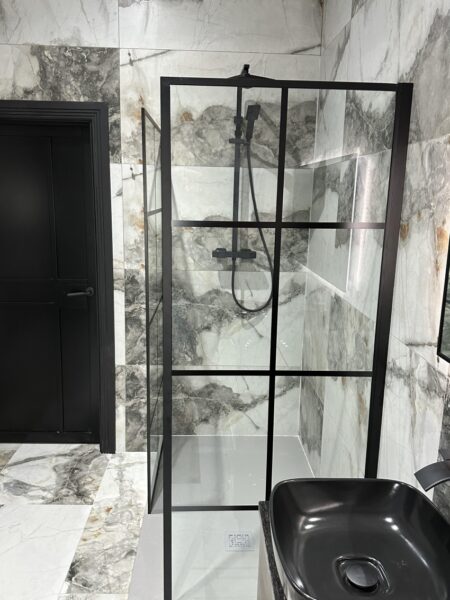 Framed in matt black accessories and paired with walnut wood, our customers definitely succeeded with this bathroom transformation.