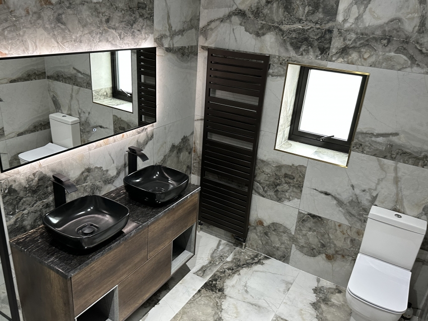 This beautiful bathroom is striking, the rust/black bold design certainly makes an impact.
