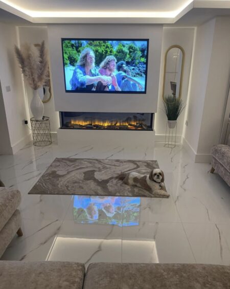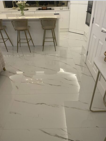 When our customers brought their kitchen door and worktop samples into our showroom, this tile instantly became the number one contender. The high white gloss reflects the natural light and the soft glod vein is the perfect compliment.