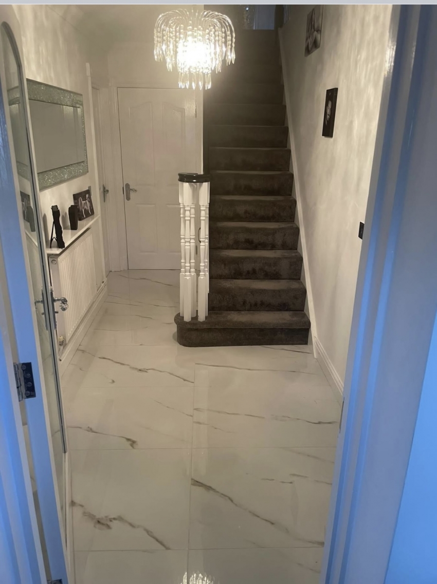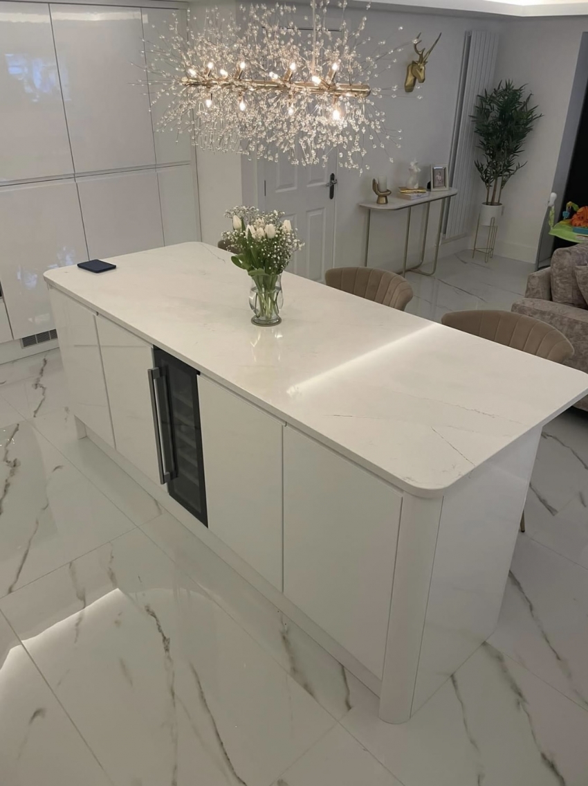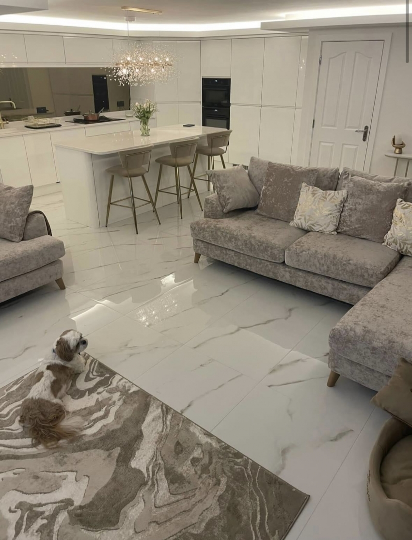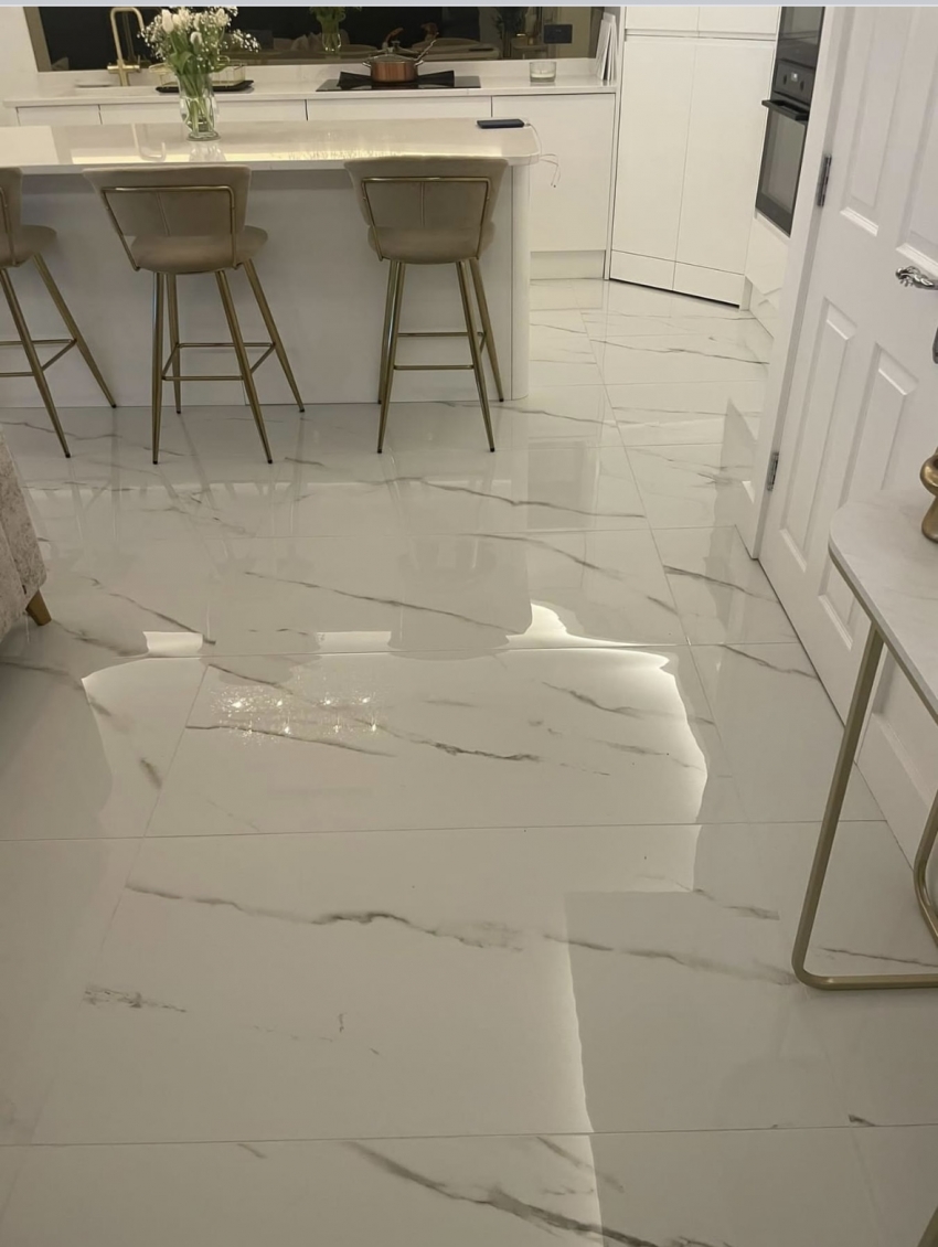 When our customers brought their kitchen door and worktop samples into our showroom, this tile instantly became the number one contender. The high white gloss reflects the natural light and the soft glod vein is the perfect compliment.